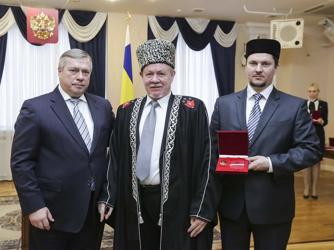 Сегодня, 12 декабря 2016г., в День Конституции РФ губернатор Ростовской области Василий Юрьевич Голубев вручил государственные награды. В числе награждённых и муфтий – председатель Центрального духовного управления мусульман Ростовской области Джафяр Зуфярович Бикмаев, удостоенный награждения за высокие достижения в деятельности религиозных организаций, направленные на возрождение и сохранение межконфессионального мира и согласия, духовных, исторических, культурных традиций, способствующих развитию Ростовской области, знаком Губернатора «За милосердие и благотворительность».