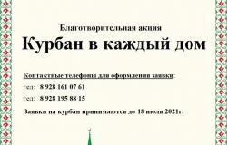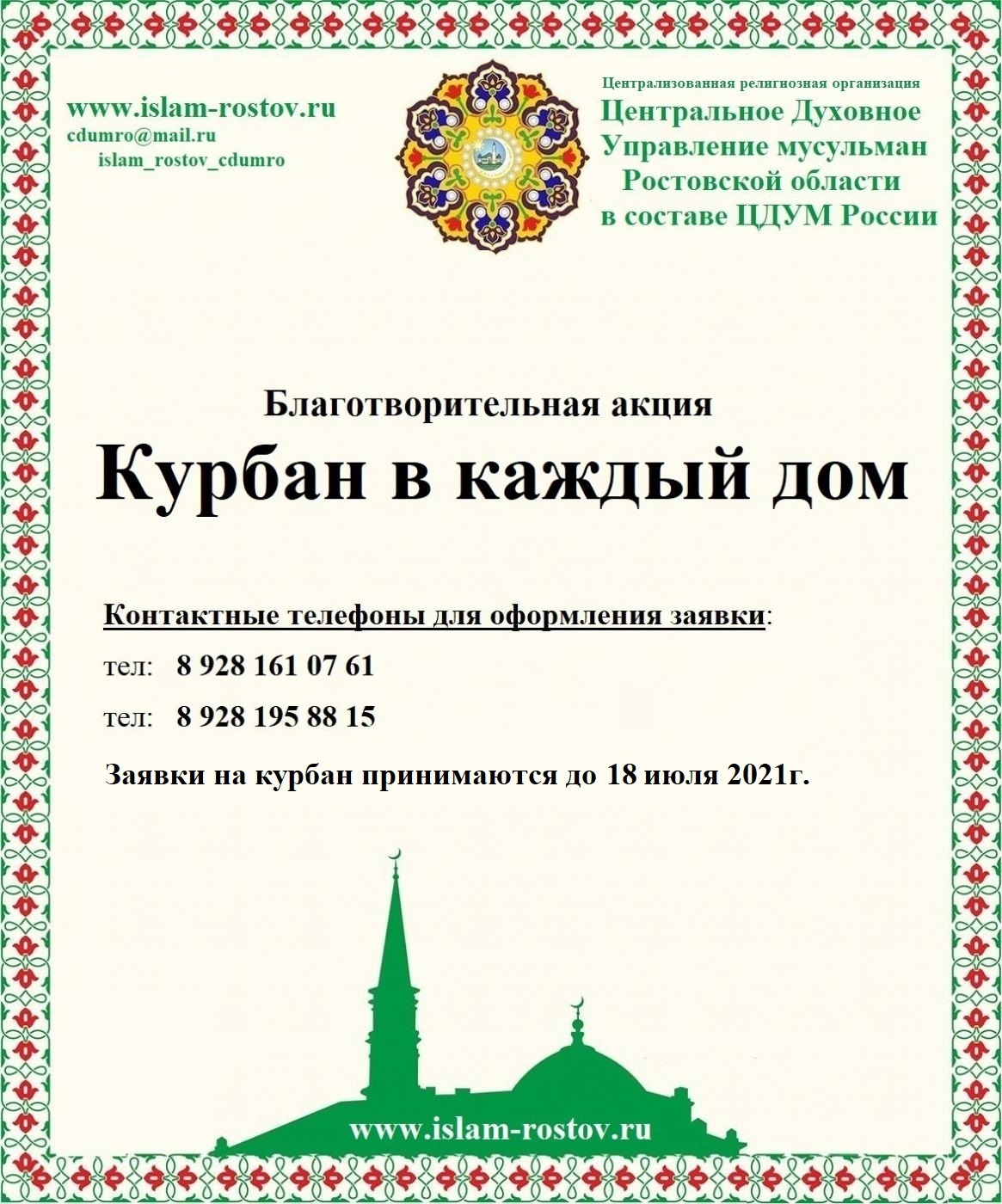 Централизованная религиозная организация «Центральное Духовное Управление мусульман Ростовской области» сообщает о приближающемся празднике Курбан Байрам, который инша Аллах состоится 20 июля 2021г.
