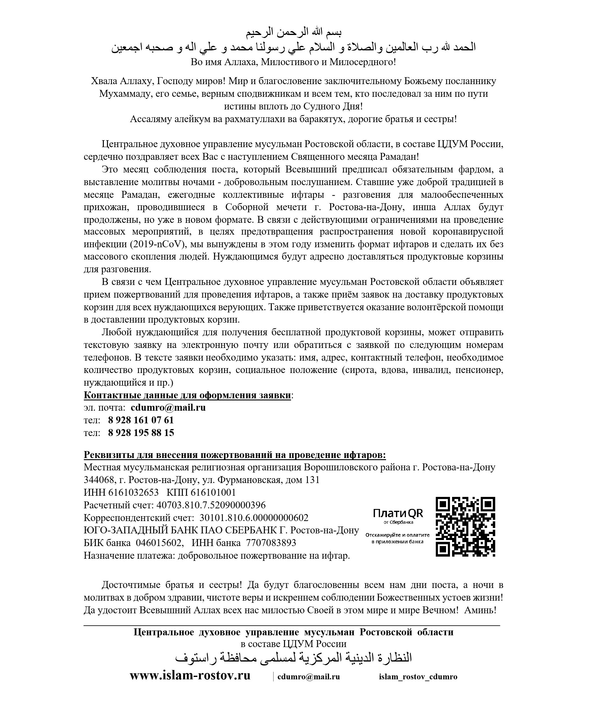 В связи с чем Центральное духовное управление мусульман Ростовской области объявляет прием пожертвований для проведения ифтаров, а также приём заявок на доставку продуктовых корзин для всех нуждающихся верующих. Также приветствуется оказание волонтёрской помощи в доставлении продуктовых корзин.
