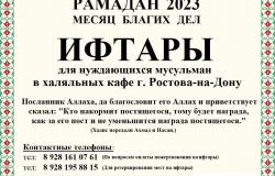 В связи с началом строительных работ по реконструкции соборной мечети г. Ростова-на-Дону и отсутствием возможности проведения данных мероприятий при мечети, ифтары-разговения будут реализованы в ряде халяльных кафе г. Ростова-на-Дону в следующей форме. Желающим разговеться необходимо связаться по телефону 8-928-195-88-15 и зарезервировать для себя место в определенном кафе. Для тех кто желает оказать добровольное пожертвование в организации данных ифтаров, необходимо связаться по телефону 8-928-161-07-61 для уточнения деталей по оплате за ифтары, по реквизитам указанным в объявлении.
