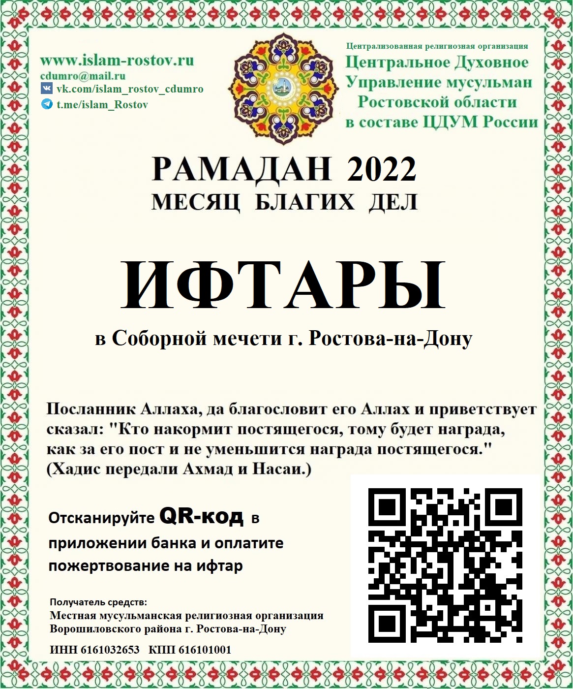 Контактный телефон для справок по организации ифтаров: 8 928 161 07 61