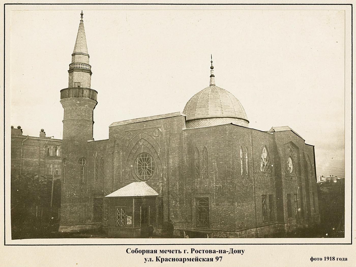 - В 1905 году, тогда ещё на самом краю города, Попечительству Ростовского-на-Дону Магометанского общества, правопреемником которого ЦДУМ РО и является, был выделен отдельный земельный участок. С того момента было дано начало строительству соборной мечети г. Ростова-на-Дону на ул. Скобелевской, ныне ул. Красноармейская 97. Строительство велось на пожертвования купцов-мусульман в честь татарских полков, отличившихся в войне против армии Наполеона.