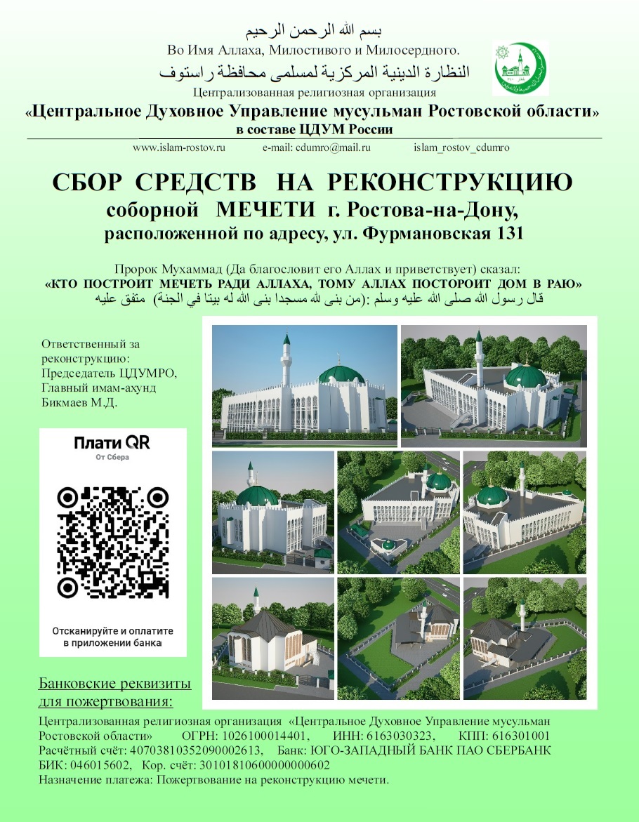 На данный момент в г. Ростов-на-Дону есть всего одна соборная мечеть, которая была построена в 2003 г. моим отцом при финансовой поддержке турецкого мецената Авни Челика. За 17 лет работы площадь действующей мечети уже исчерпана. Вместимость самой мечети составляет 1500 человек. Джума намазы посещают от 1800 до 2000 мусульман, и в последние годы существует острая необходимость в её расширении. Слава Аллаху, недавно мы объявили о намерении реконструировать и расширить единственную соборную мечеть города и начали сбор средств на эти цели. Инша Аллах, ближе к концу года, если Аллах позволит собрать необходимые средства, мы приступим непосредственно к самому строительству.