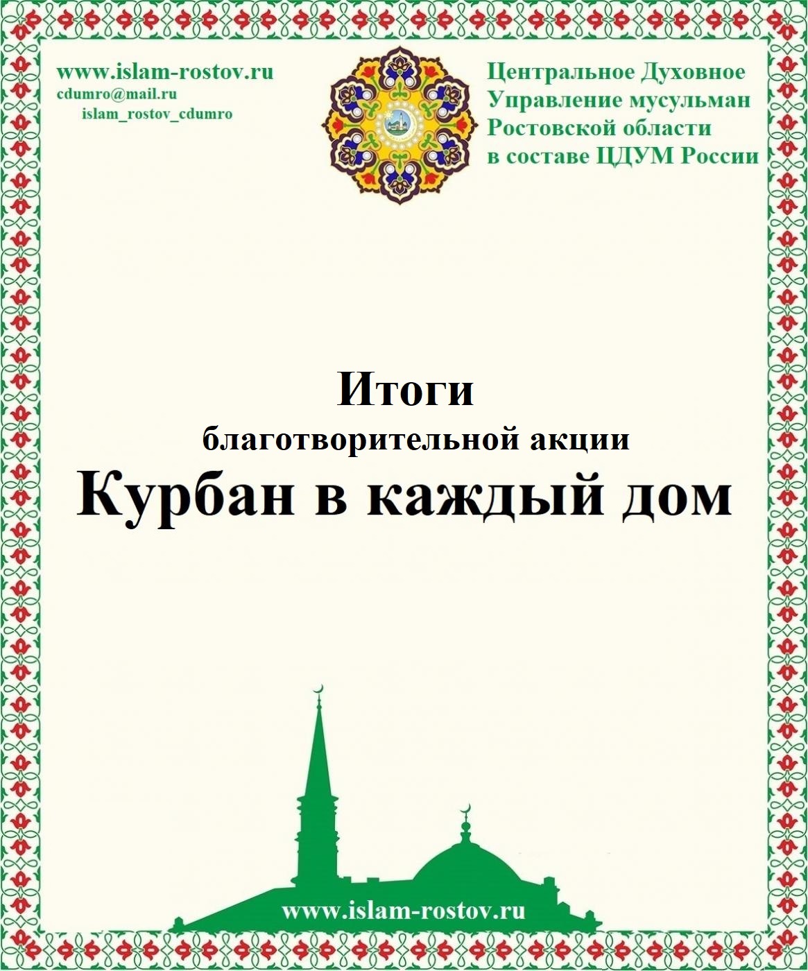 Центральное Духовное Управление мусульман Ростовской области поздравляет верующих с прошедшим праздником Курбан Байрам и благодарит всех тех, кто принял участие в осуществлении данного благого дела. Да воздаст им Аллах благом в обоих мирах.