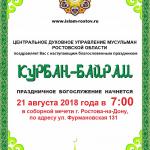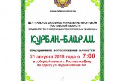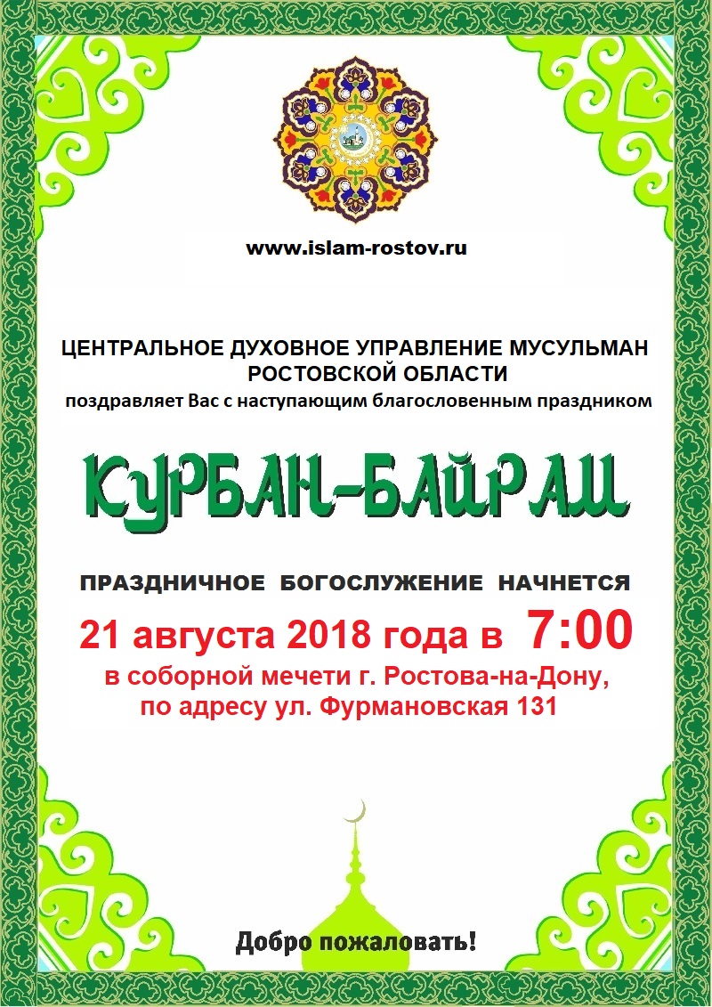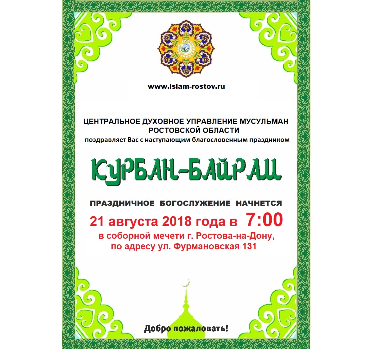 Уважаемые братья и сестры! Центральное духовное управление мусульман Ростовской области поздравляет вас с наступающим благословенным праздником Ид аль-Адха "Курбан-Байрам" и сообщает, что праздничное Богослужение, Инша Аллах состоится 21 августа 2018г. в 7:00 в соборной мечети г. Ростова-на-Дону по адресу ул. Фурмановская 131.