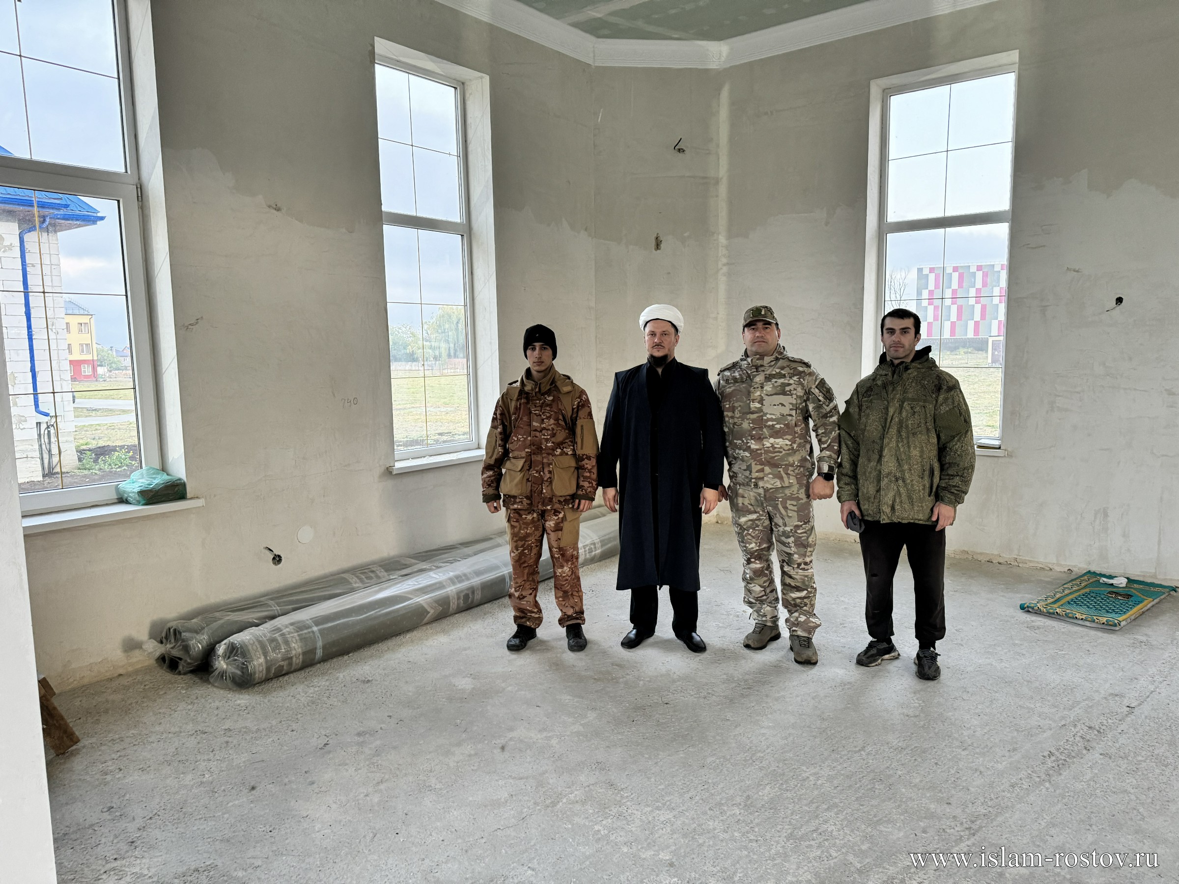 Глава мусульманского духовенства пообщался с военнослужащими, ознакомился с ходом строительных работ и передал ковёр для будущей мечети, подарок от директора АО «Меринос» Исаева Тагира Курбановича. Военнослужащие выразили благодарность за ценный подарок и выразили надежду на скорейшее завершение строительных работ духовного комплекса