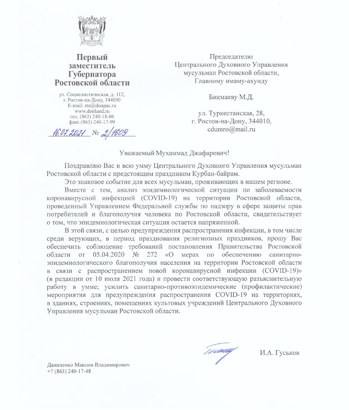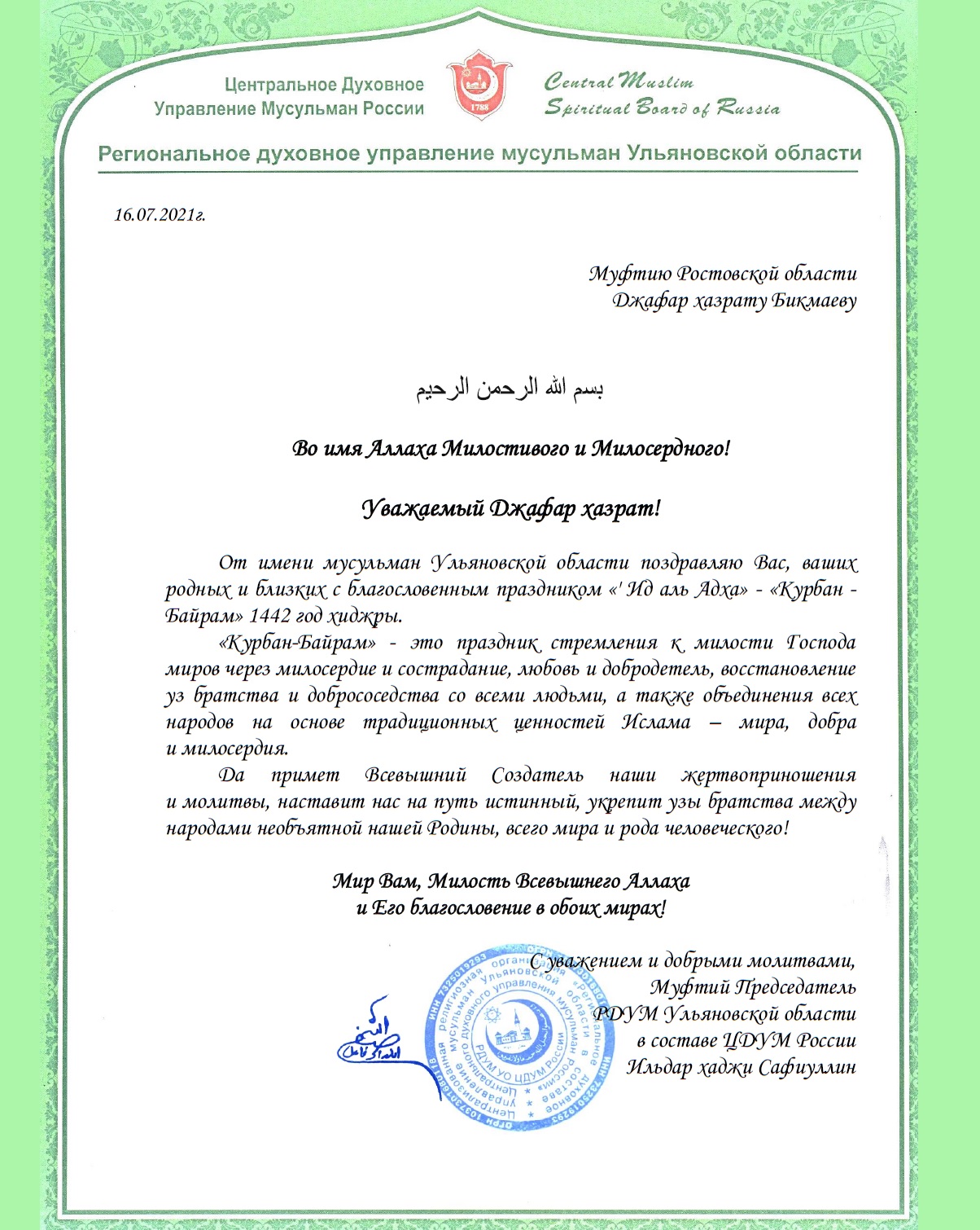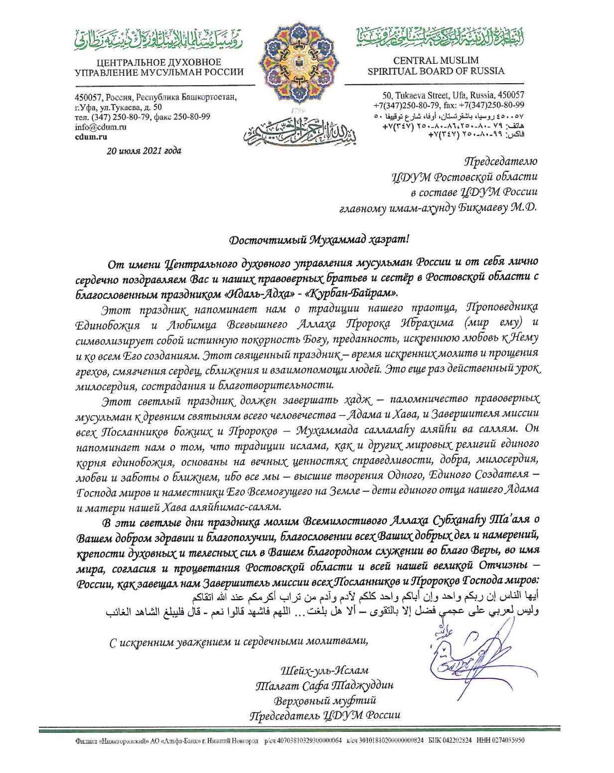 Традиционно, в адрес мусульман были направлены поздравительные телеграммы от Президента РФ В.В. Путина, Верховного муфтия России Талгат хазрата Таджуддина, Первого заместителя Губернатора Ростовской области И.А. Гуськова, Первого заместителя Губернатора Ростовской области В.Г. Гончарова, Председателя комитета по межнациональным вопросам, религии и казачеству Администрации г. Ростова-на-Дону Ю.В. Аникиной, а также от глав Духовных управлений мусульман различных регионов России.