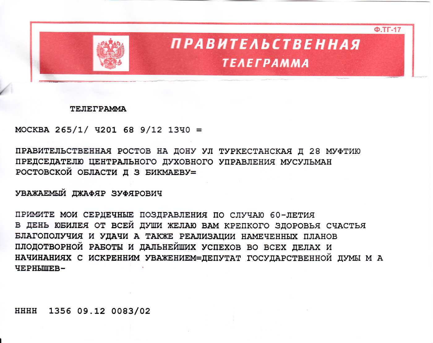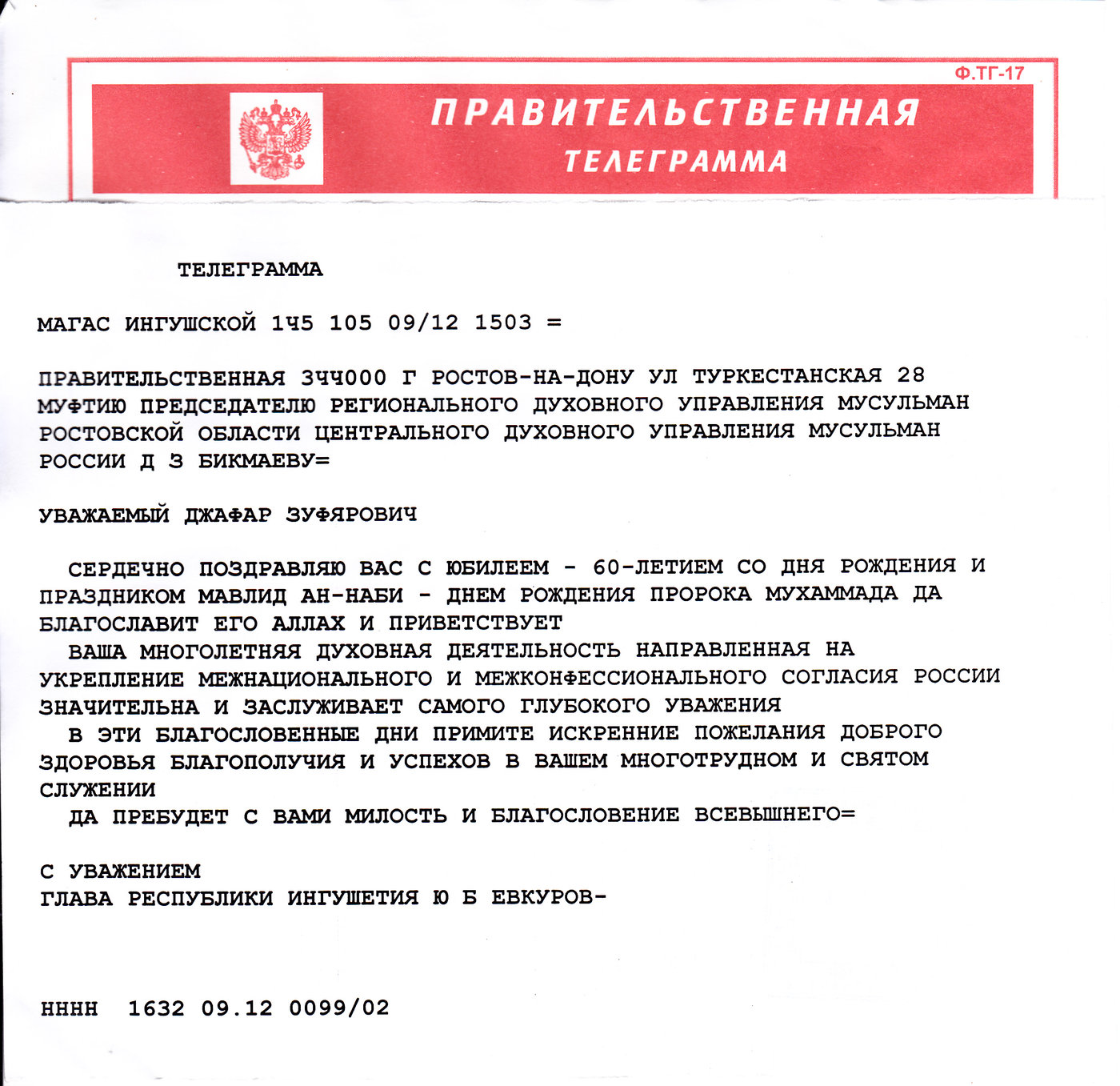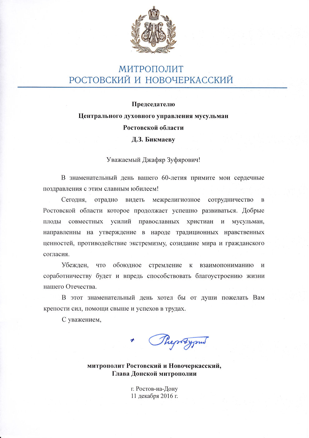 Коллектив Центрального Духовного Управления мусульман Ростовской области, его друзья и коллеги по всей стране сердечно поздравляют Муфтия Ростовской области Бикмаева Джафяра Зуфяровича с 60-летием и 35-летием  служения Всевышнему Аллаху и вступления в должность муфтия и благодарят за огромный вклад в дело духовно-нравственного возрождения российской уммы, развитию добрых отношений с людьми других вер и убеждений!