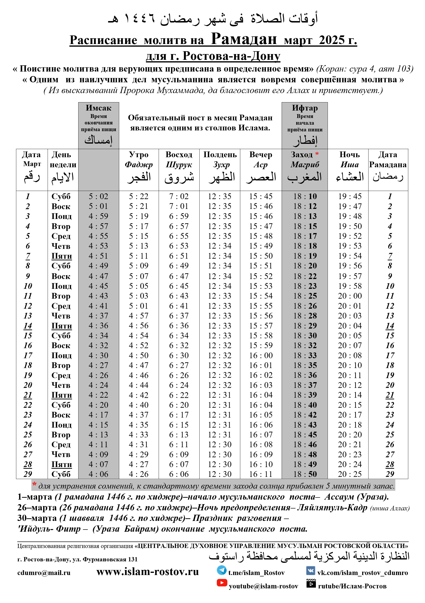 Да будут благословенны всем нам дни Поста, а ночи в молитвах в добром здравии, чистоте веры и искреннем соблюдении Божественных устоев жизни! Да удостоит Всевышний Аллах всех нас милостью Своей в обоих мирах! Амин.