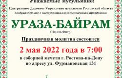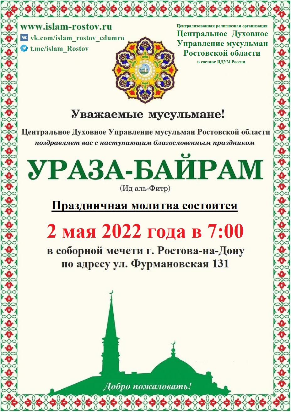 Праздничная молитва УРАЗА-БАЙРАМ состоится в 7:00 2 мая 2022г.