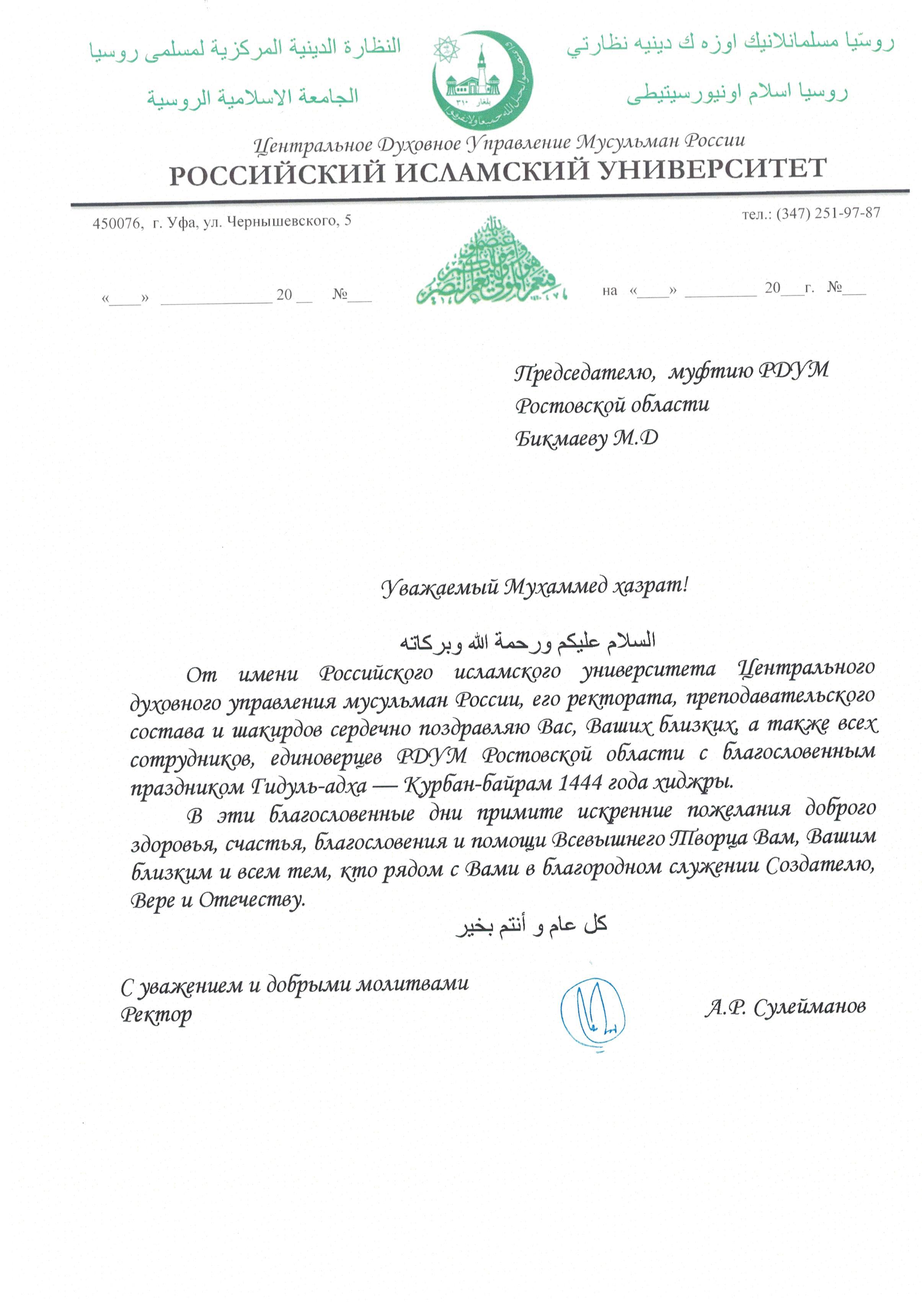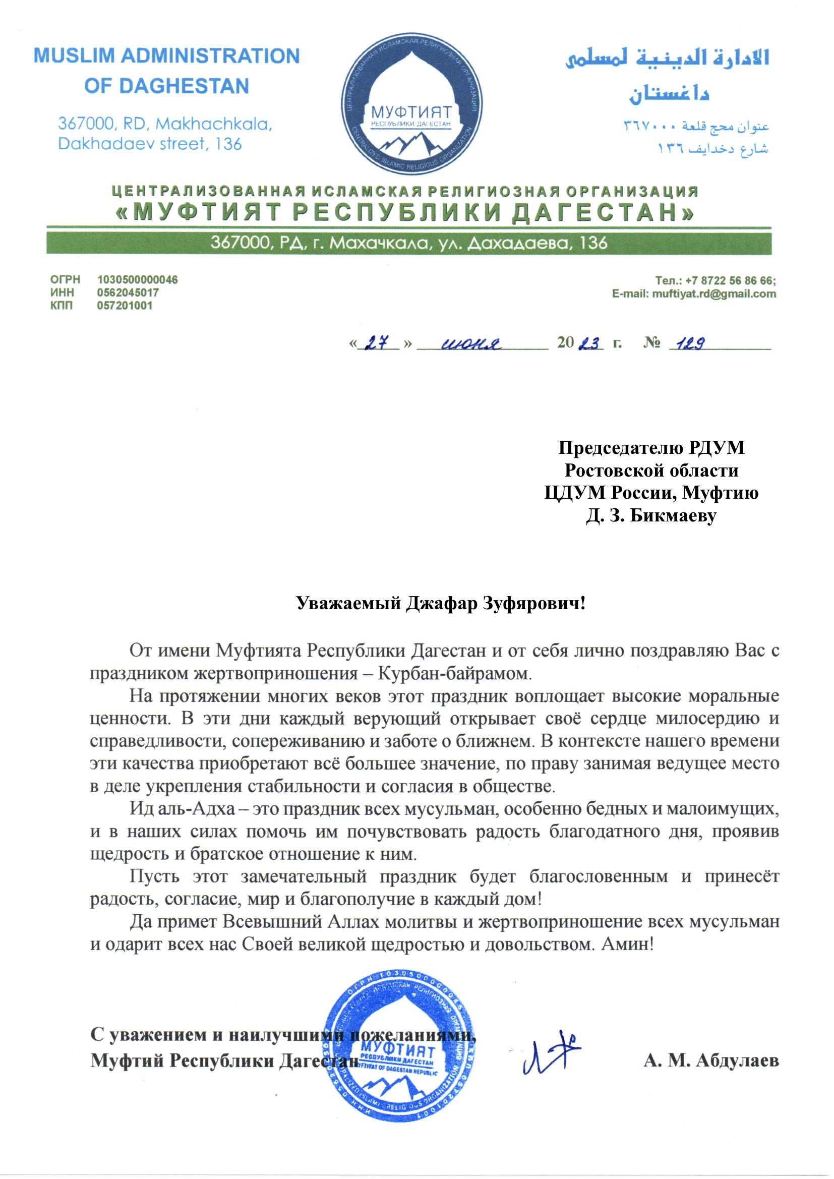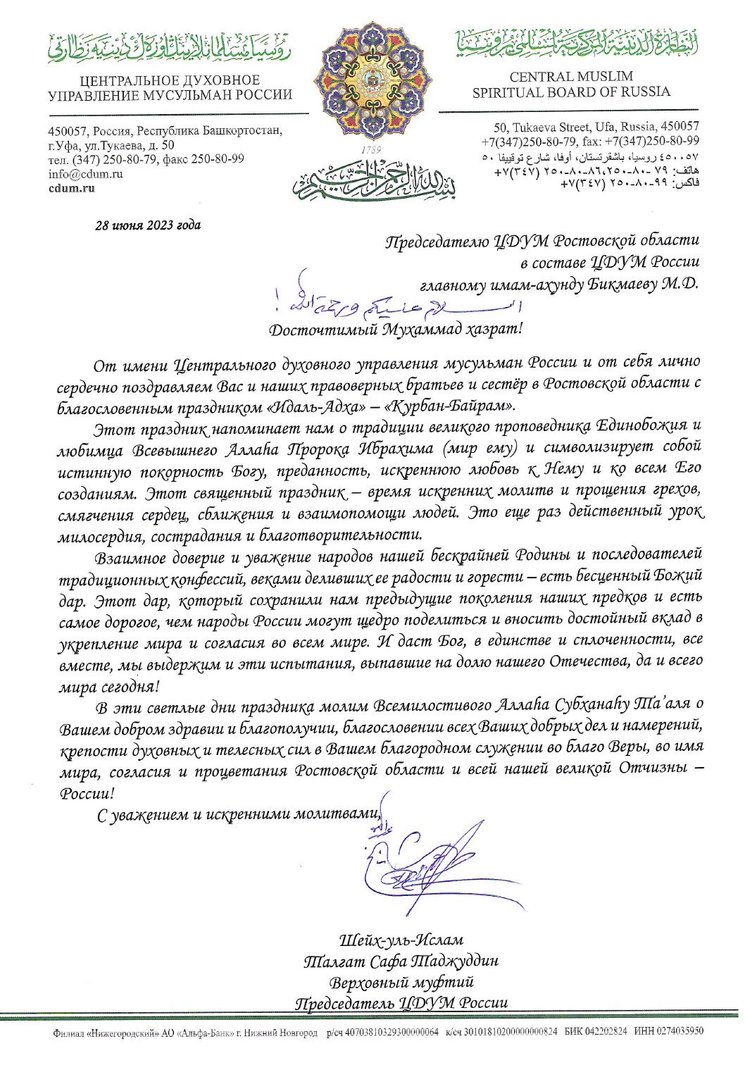 Приветствуя собравшихся, глава  Центрального Духовного Управления мусульман Ростовской области Мухаммед хазрат Бикмаев, провёл коллективную праздничную молитву, а затем в своей праздничной проповеди поздравил верующих с благословенным праздником Ид аль-Адха – Курбан-байрам! Мухаммед хазрат Бикмаев, напомнил единоверцам о том, что этот праздник напоминает нам о традиции нашего праотца, проповедника Единобожия и любимца Всевышнего Аллаха Пророка Ибрахима (мир ему) и символизирует собой истинную покорность Богу, преданность и искреннюю любовь к Нему. Этот священный праздник время принятия молитв и прощения грехов искренне верующих, смягчения сердец, сближения и взаимопомощи людей, это торжество милосердия, сострадания и благотворительности.