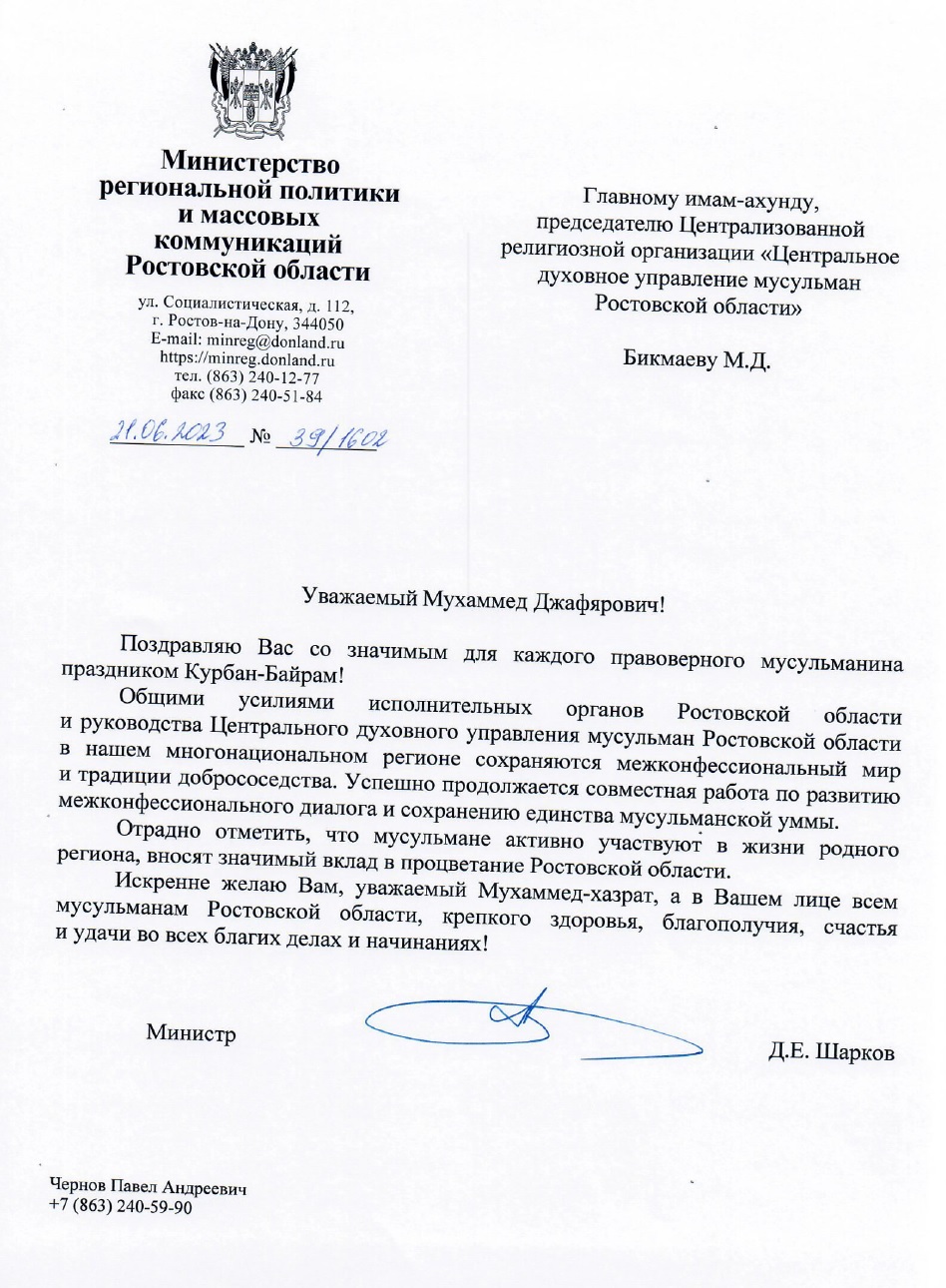 Традиционно, в адрес мусульман были направлены поздравления от  Президента Российской Федерации Владимира Владимировича Путина, Верховного муфтия России, Шейх-уль-ислама Талгат хазрата Таджуддина, Министра региональной политики и массовых коммуникаций Ростовской области Дмитрия Евгеньевича Шаркова, Главы Администрации города Ростова-на-Дону Алексея Валентиновича Логвиненко, а также от глав Духовных управлений мусульман различных регионов России.