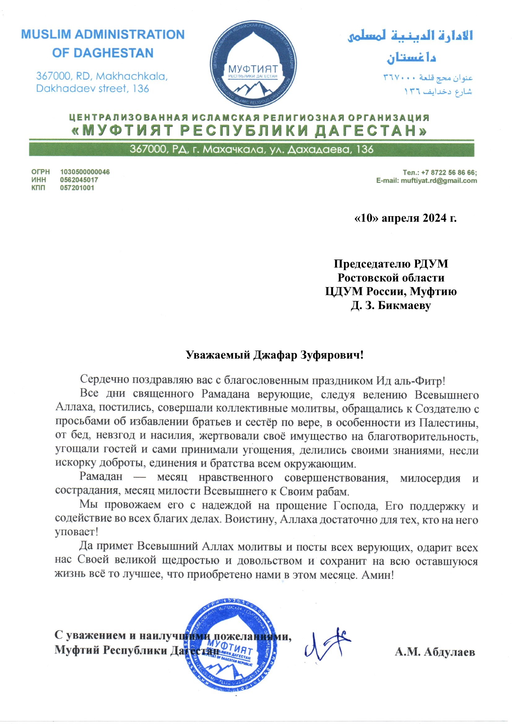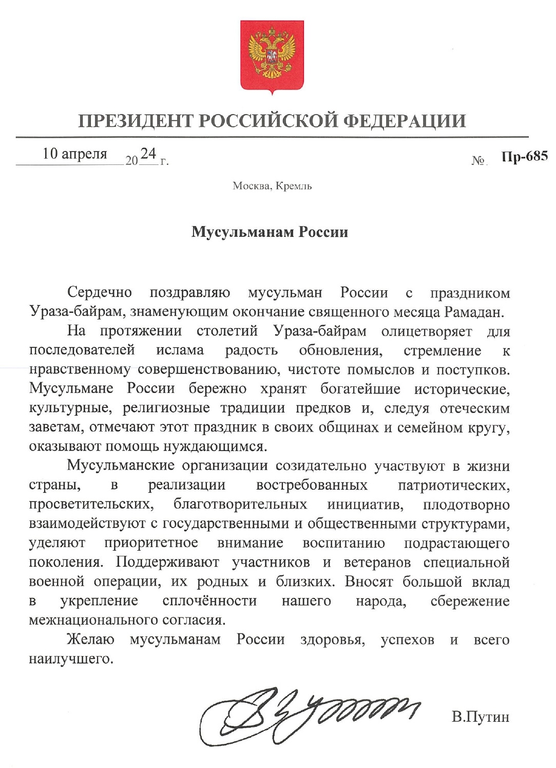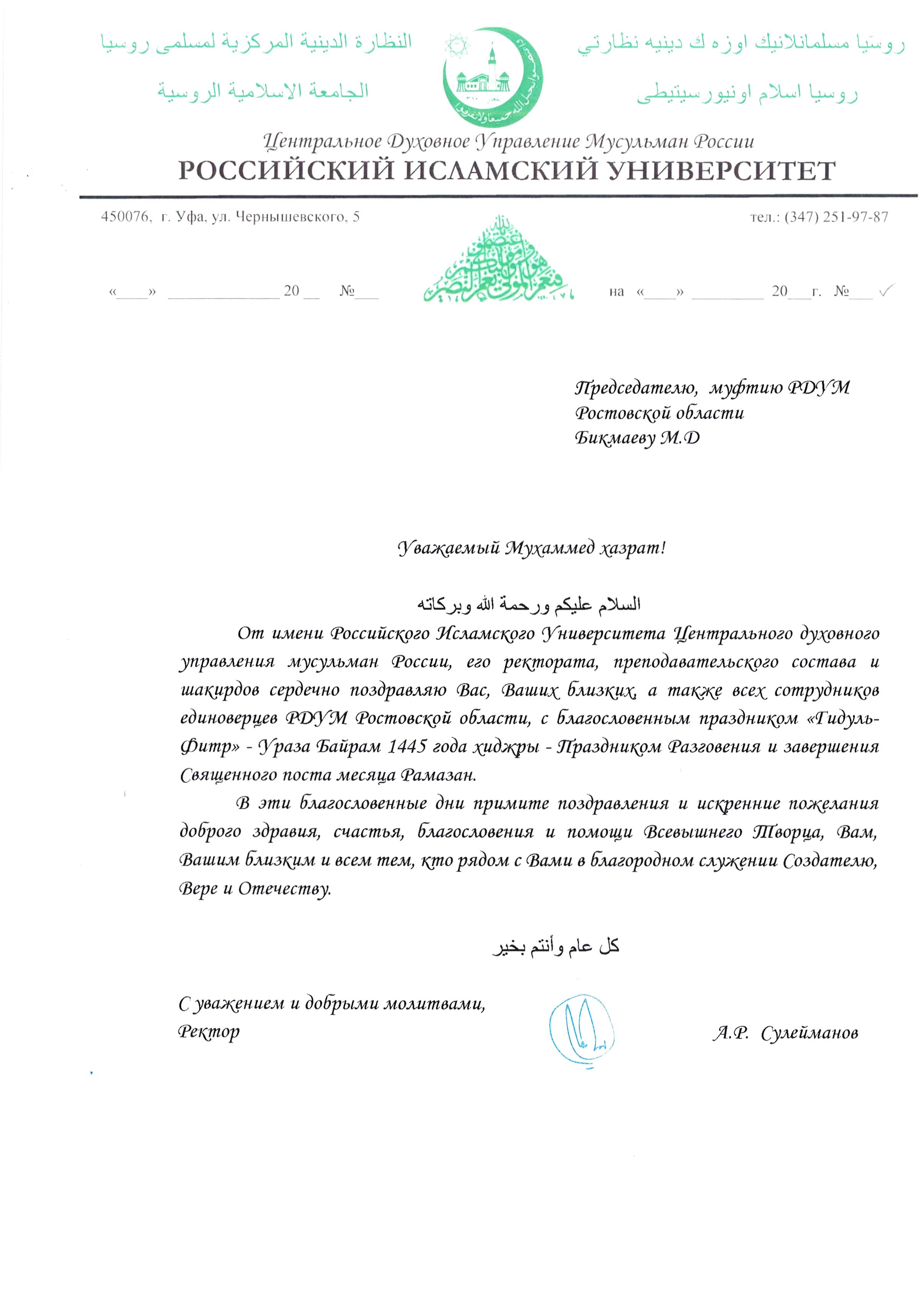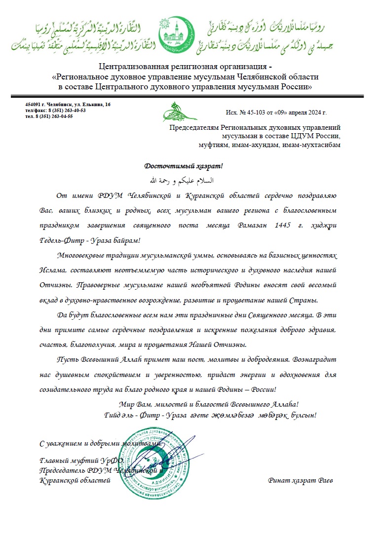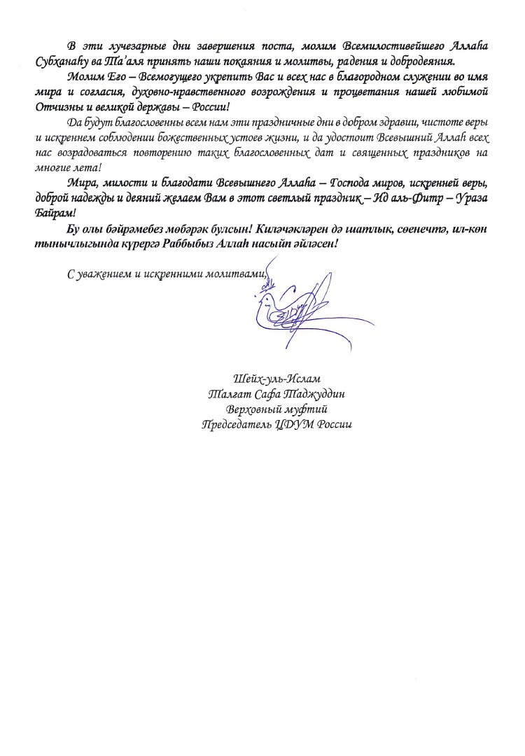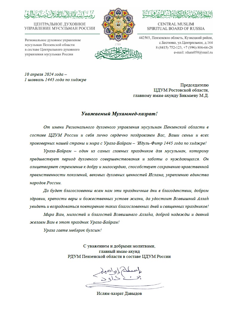 Традиционно, в адрес мусульман были направлены поздравления от Президента Российской Федерации Владимира Владимировича Путина, Верховного муфтия России, Шейх-уль-ислама Талгат хазрата Таджуддина, а также от глав Духовных управлений мусульман различных регионов России.