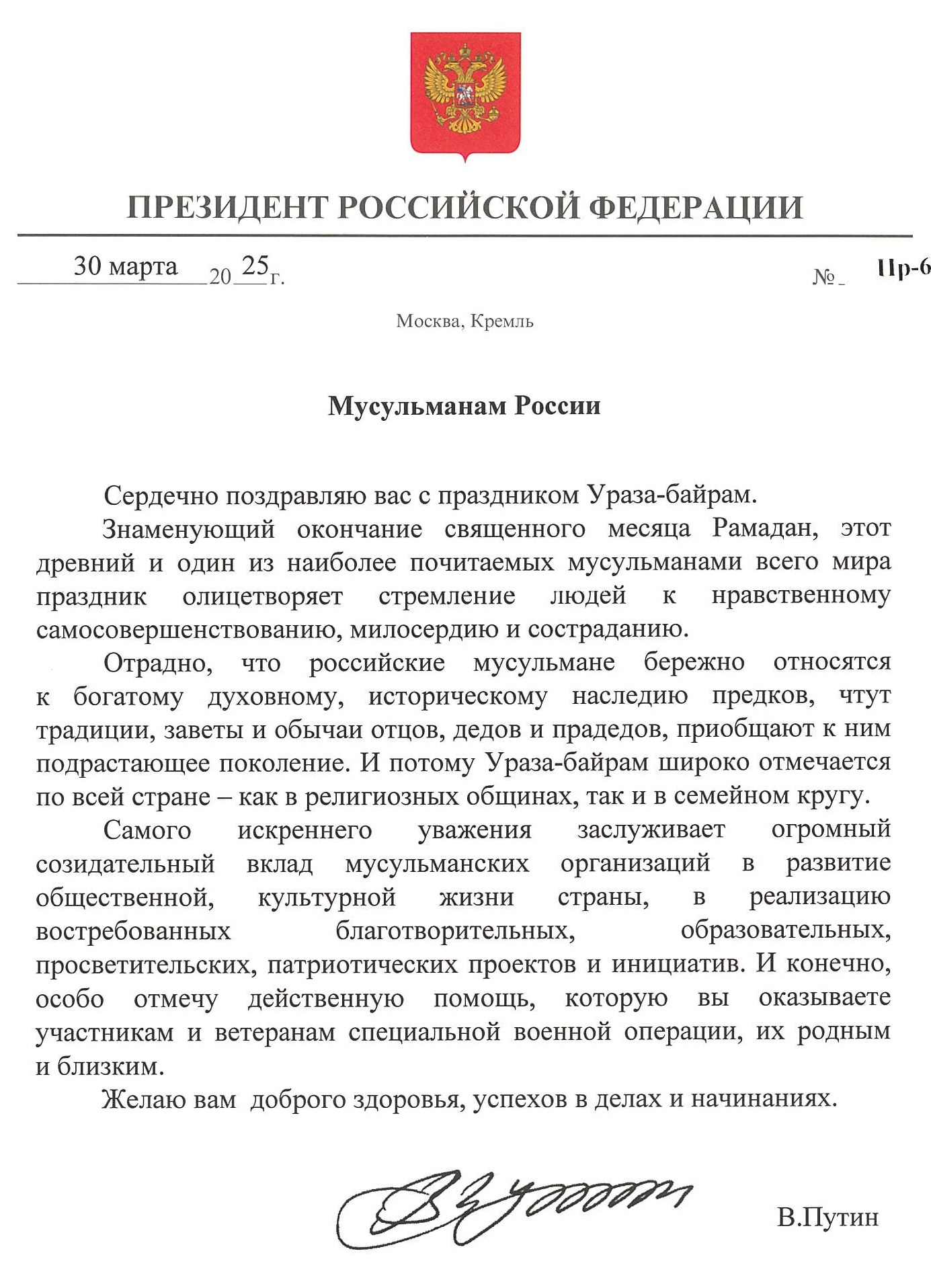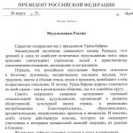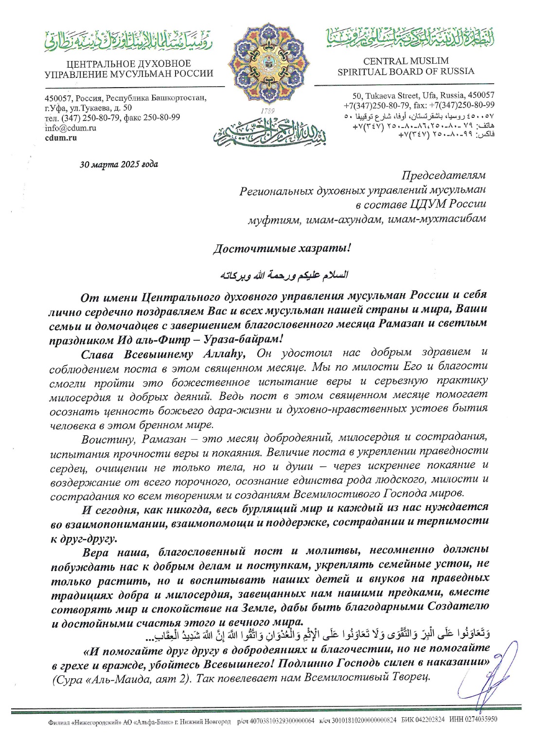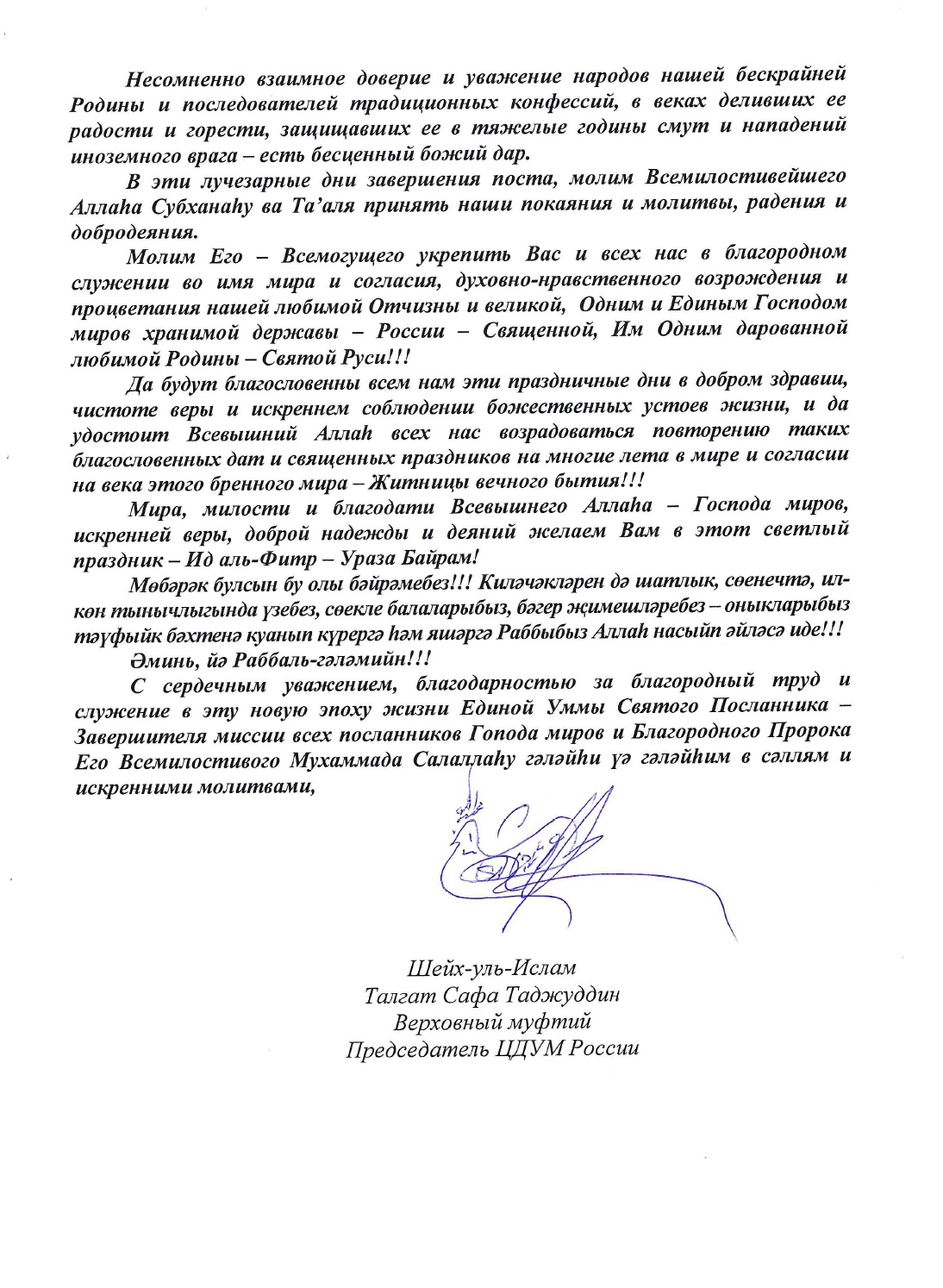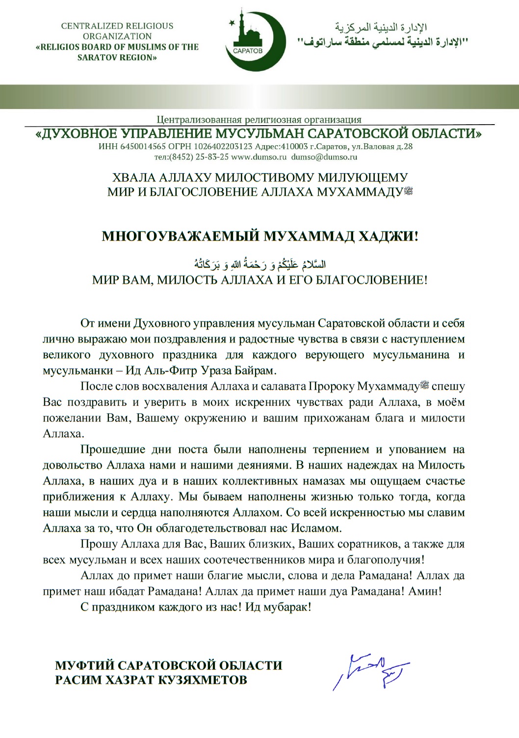 Традиционно, в адрес мусульман были направлены поздравления от Президента Российской Федерации Владимира Владимировича Путина, Верховного муфтия России, Шейх-уль-ислама Талгат хазрата Таджуддина, а также от глав Духовных управлений мусульман различных регионов России.