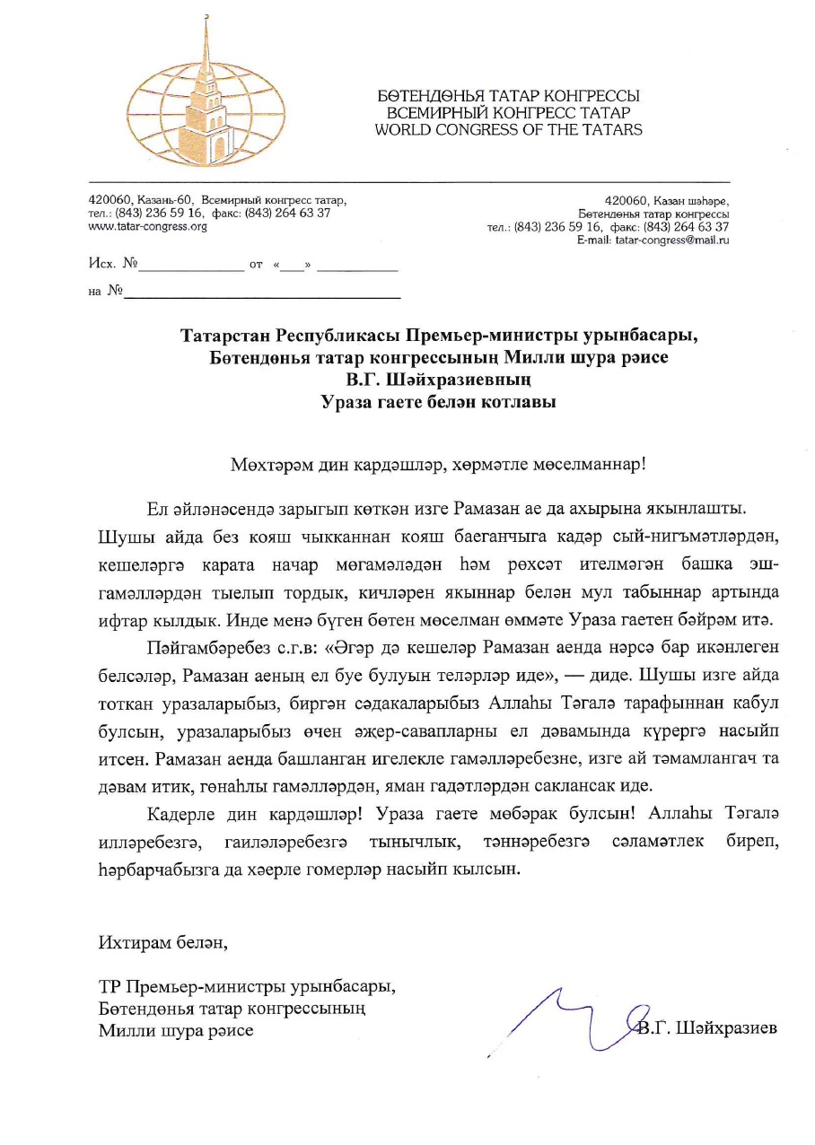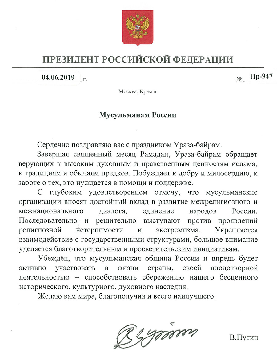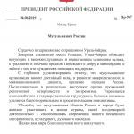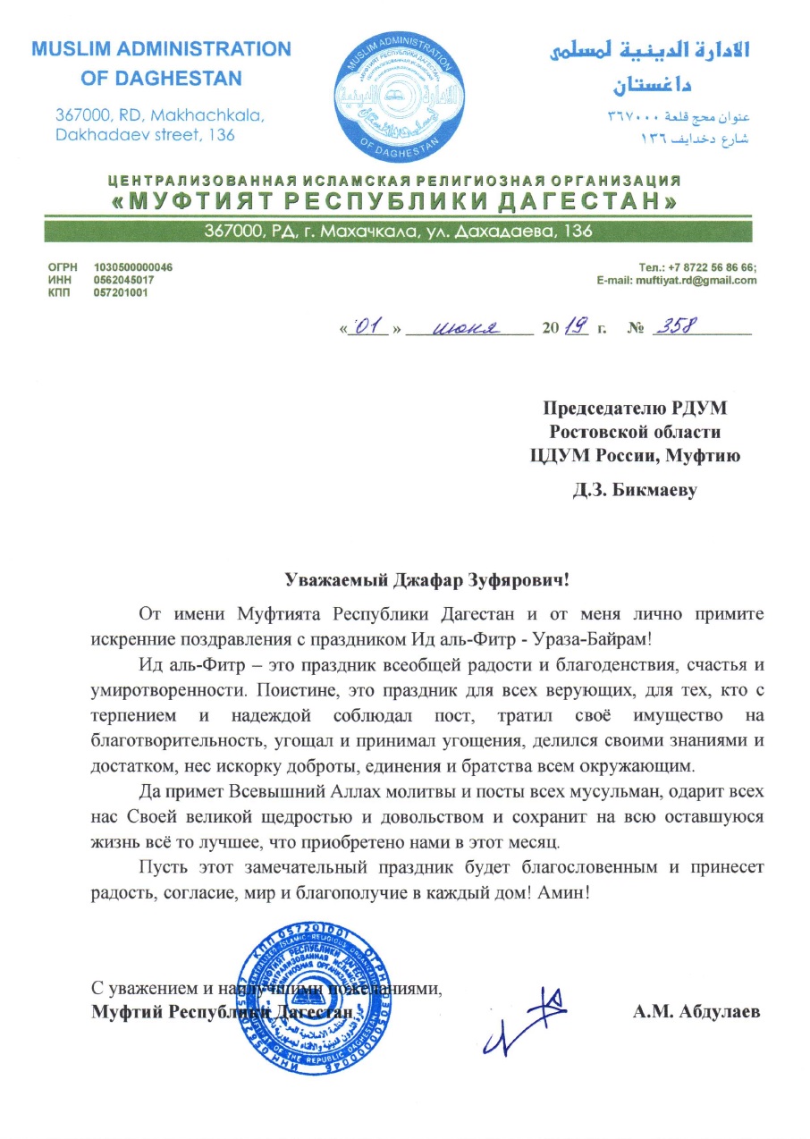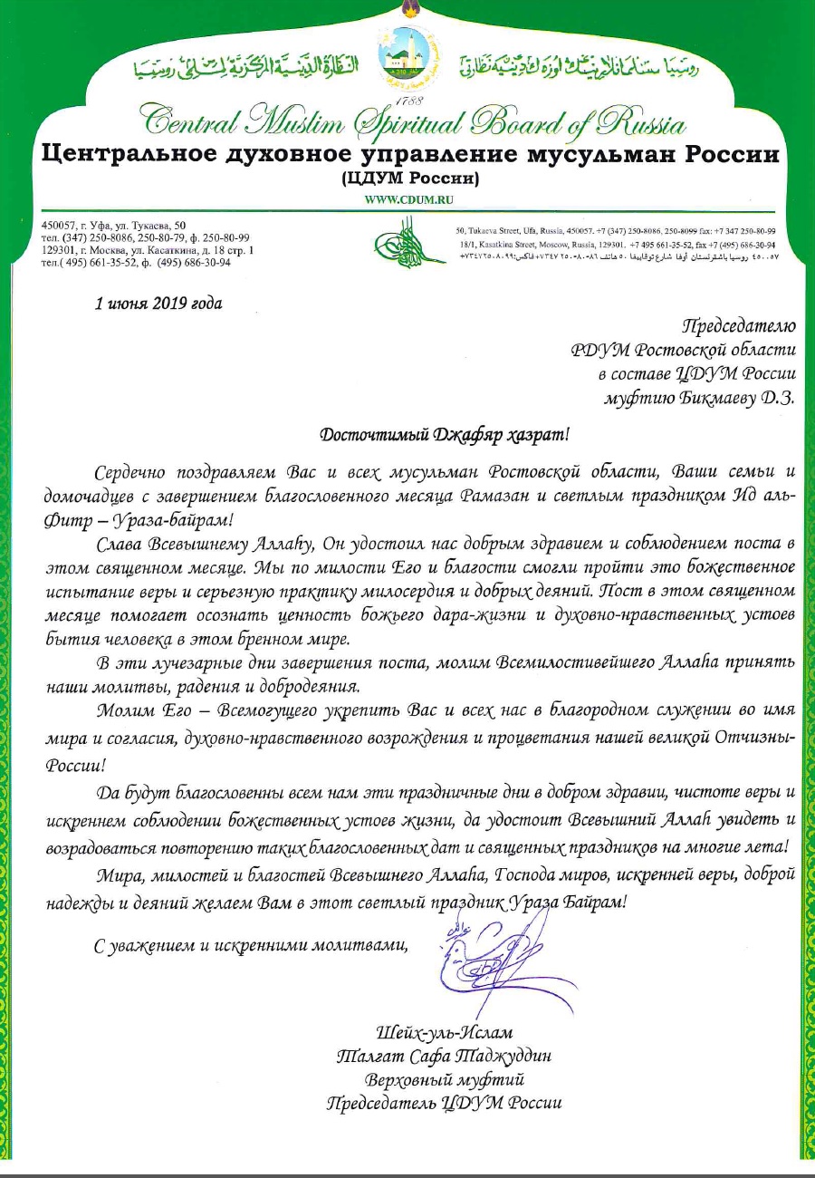 Традиционно, в адрес мусульман были направлены поздравительные телеграммы от Президента РФ В.В. Путина, Председателя Правительства России Д.А. Медведева, Заместителя губернатора Ростовской области В.В. Рудого, Верховного муфтия России Талгат хазрата Таджуддина а также от глав Духовных управлений мусульман различных регионов России.
