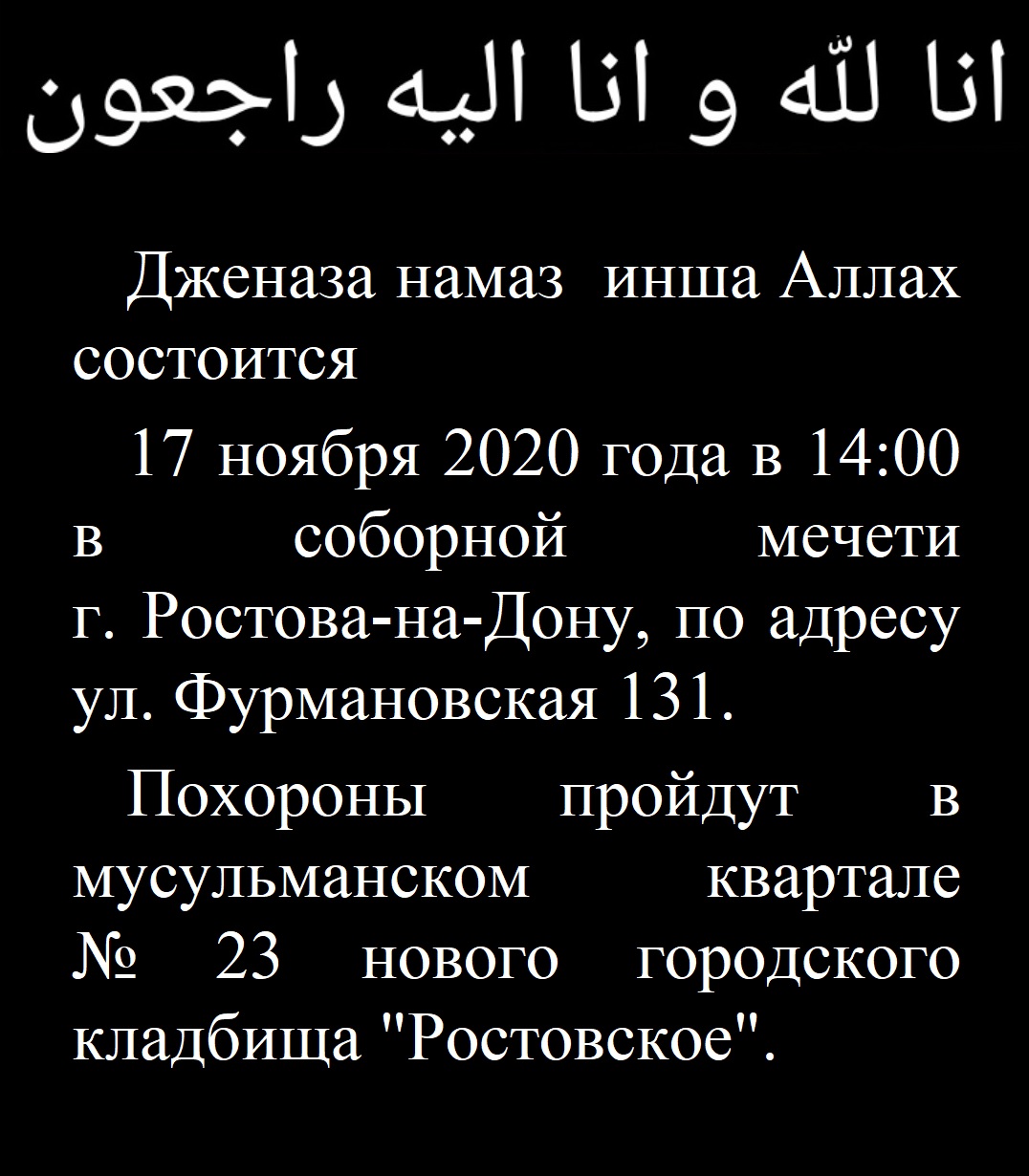 От имени Меджлиса Центрального Духовного Управления Мусульман Ростовской области в составе ЦДУМ России, от всех имамов, муадзинов,  мусульман Ростовской области и соотечественников с чувством глубокой скорби, выражаем искренние соболезнования родным и близким Джафяр хазрата Бикмаева.