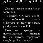 Дженаза намаз (заупокойная молитва) инша Аллах состоится 17 ноября 2020 года в 14:00 в построенной Джафяр хазратом Бикмаевым соборной мечети г. Ростова-на-Дону, по адресу ул. Фурмановская 131. Похороны пройдут в мусульманском квартале № 23 нового городского кладбища "Ростовское".