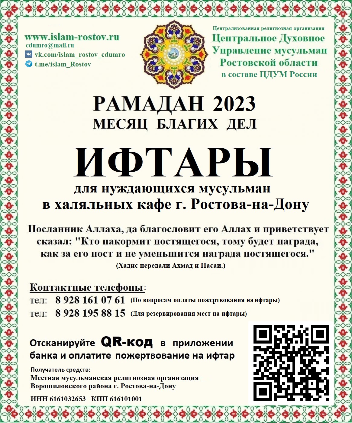 В связи с началом реконструкции соборной мечети г. Ростова-на-Дону и отсутствием возможности проведения коллективных разговений при мечети, ифтары проводятся в ряде халяльных кафе города. Желающие принять участие в благотворительной акции «Рамадан месяц благих дел» могут связаться по телефону 8-928-161-07-61 для консультации и оказания пожертвования в организации ифтаров для нуждающихся.