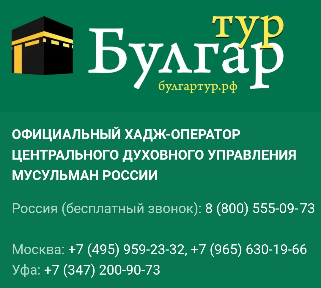 В 2019 г. организацию хаджа от Центрального Духовного Управления мусульман России осуществляет аккредитованный туроператор ООО "Булгар-Тур". Вылет в хадж в этом году, инша Аллах планируются в конце июля.