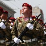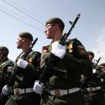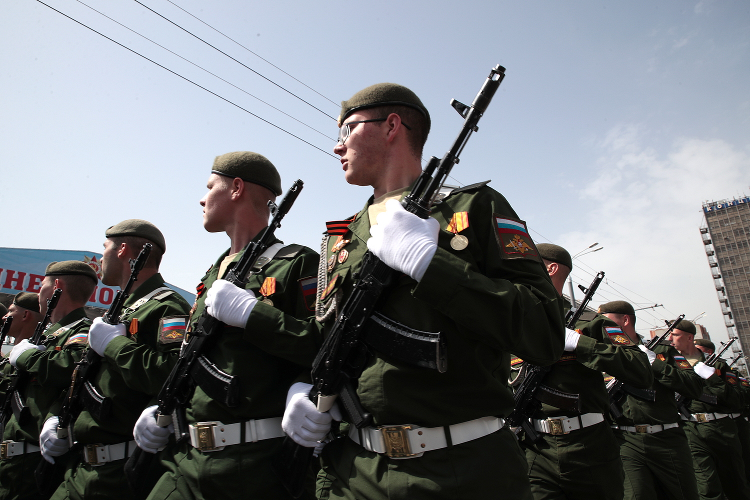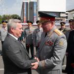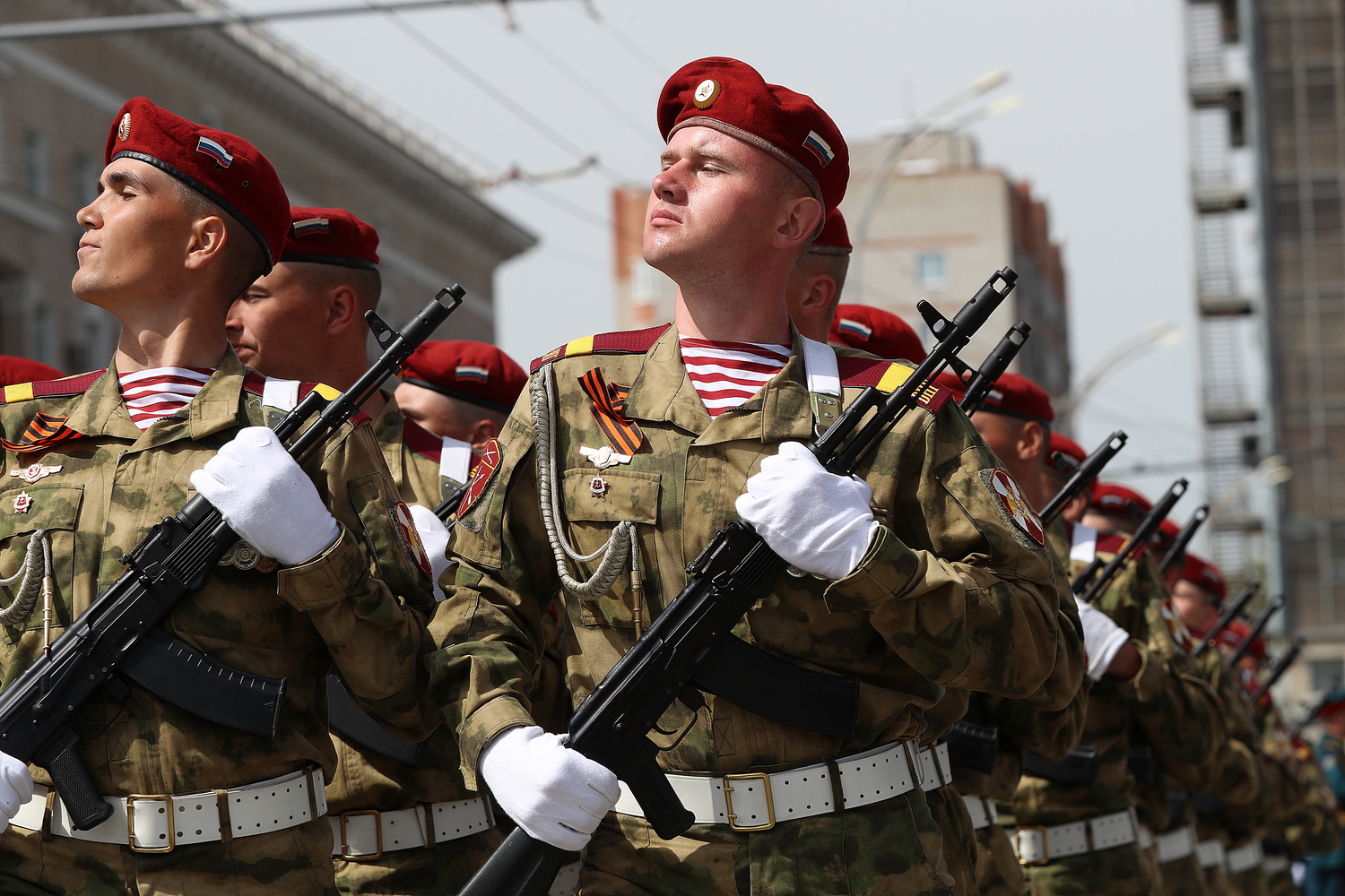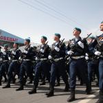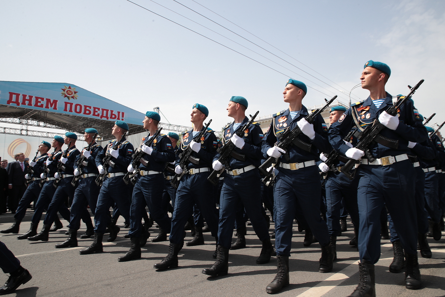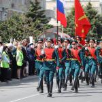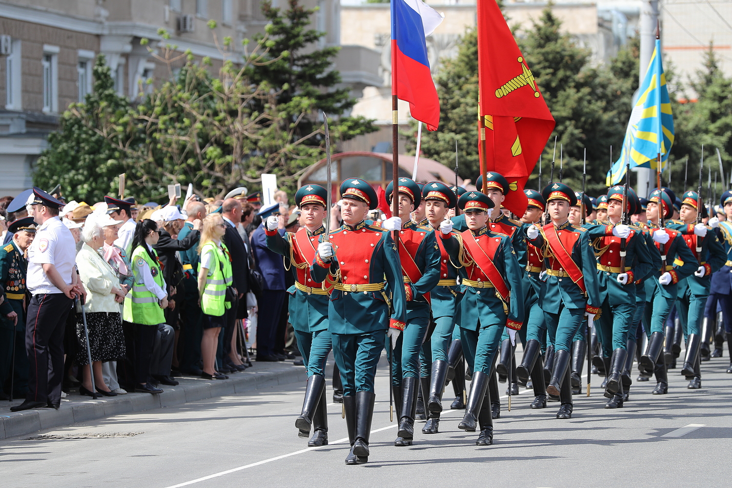 Вместе с ветеранами присутствующие наблюдали, как по Театральной площади торжественным маршем прошла рота Почетного караула.